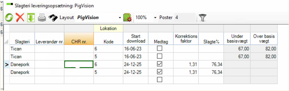 Ved Danepork, skal man huske at tilføje kolonnen ”CHR” i vinduet ”Slagteri leveringsopsætning” og skrive det CHR-nummer, som Danepork har registreret sammen med leverandørnummeret (som oftest er det samme som CHR).