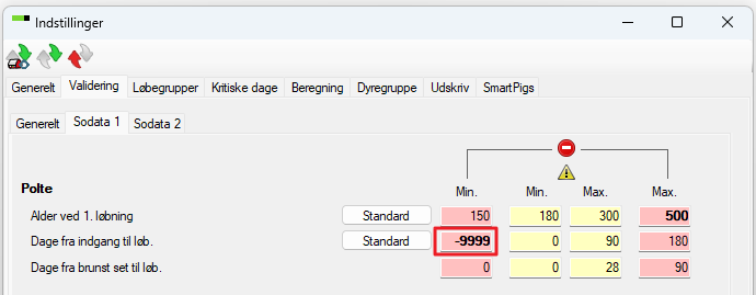 NB: før du importerer dyr i PigVision skal du ændre på valideringen "Dage fra indgang til løb." Det gør du under Generelt, Opsætning, Validering, Sodata 1. "Dage fra indgang til løb." sættes til -9999 .