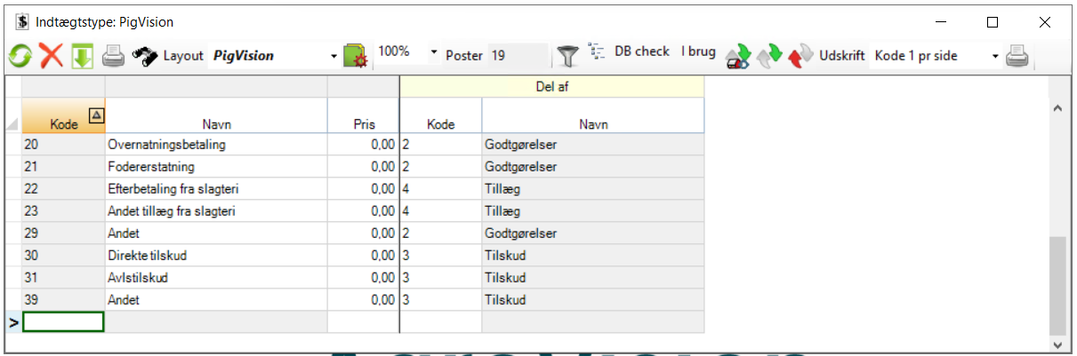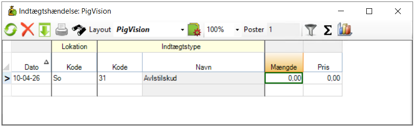 - "Pris": Her skriver du indtægtens pris. PigVision kan dog selv regne denne pris ud baseret på mængden, hvis du har indtastet en pris i "Indtægtstype".