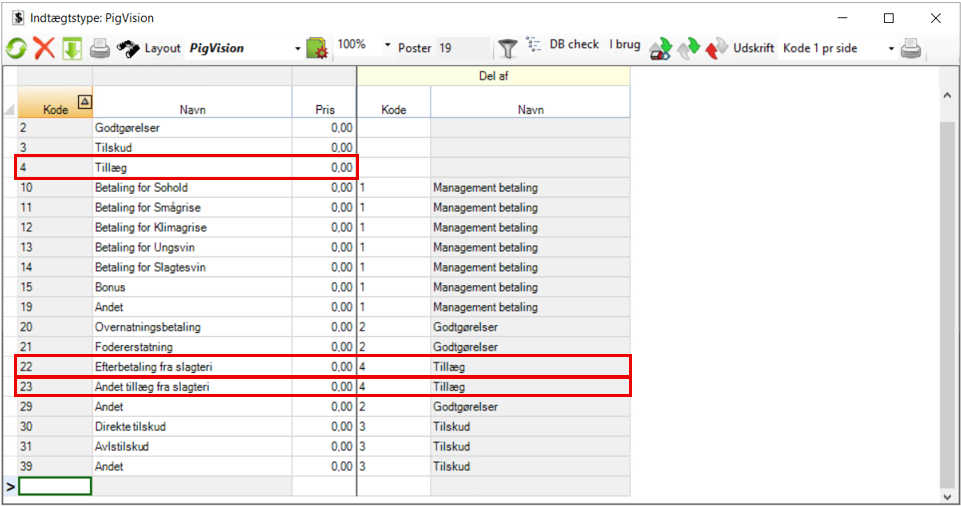 Kolonnen "Del af" bliver brugt til at angive, hvis indtægtstypen er en del af en samlet indtægtstype. Er dette tilfældet, skal du huske, at du skal have lavet en samlet indtægtstype først med kode og navn. Eksempelvis kunne det være, at du havde en samlet indtægtstype "Tillæg", hvor indtægtstyperne "Efterbetaling fra slagteri" og "Andet tillæg fra slagteri" er en del af. Dermed skal de to indtægtstyper kobles på kode 4.