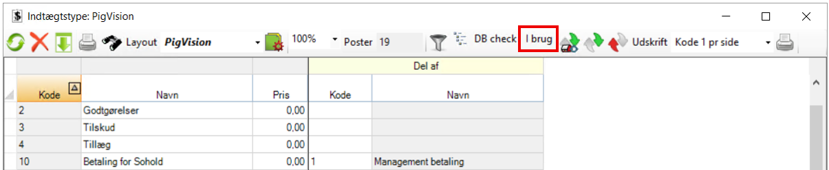 - I brug: Tryk på denne for at se, om den markerede indtægtstype er i brug i PigVision. Et nyt vindue vil efterfølgende komme frem, hvor der står, hvor indtægtstypen er brugt.