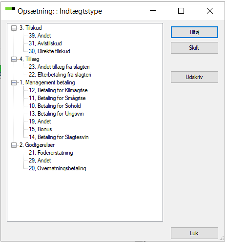 Start med at oprette en kode og et navn for indtægtstypen. Derefter er det muligt at angive en pris på indtægtstypen. Det kan eksempelvis være betaling for smågrise og klimagrise.