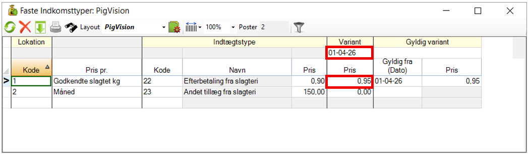 I nedenstående eksempel ses, at prisen for efterbetaling fra slagteri d. 1-4-26 ændres fra 0,90kr. til 0,95kr. PigVision vil stadig huske de tidligere priser, så din økonomi i E-kontrollen stemmer med perioderne.