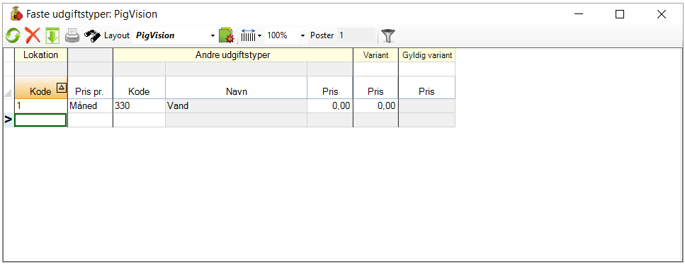 • "Andre udgiftstyper": Her angiver du, hvilken udgiftstype du vil registrere, som en fast udgift (udgiftstyperne opretter du i "Øvrige indtastninger" - "Udgiftstype"). Angiv blot koden for udgiftstypen, hvorefter navn og pris vil blive udfyldt automatisk. Hvis du ikke har angivet en pris for udgiftstypen, så er det muligt at skrive prisen ind her. Dog skal du være opmærksom på, at hvis du retter prisen ét sted, så rettes den automatisk det andet sted.