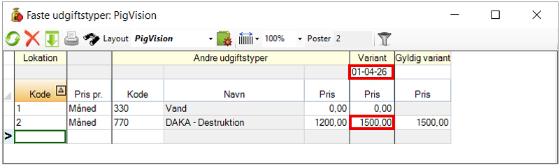 I nedenstående eksempel ses, at prisen for DAKA destruktion d. 1-4-26 ændres fra 1200kr. til 1500 kr. PigVision vil stadig huske de tidligere priser, så din økonomi i E-kontrollen stemmer med perioderne.