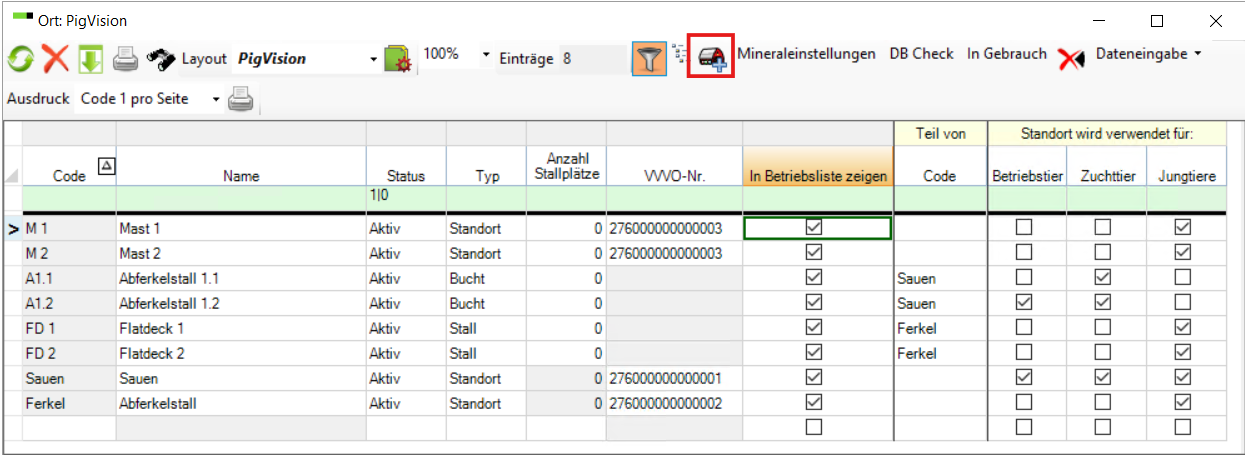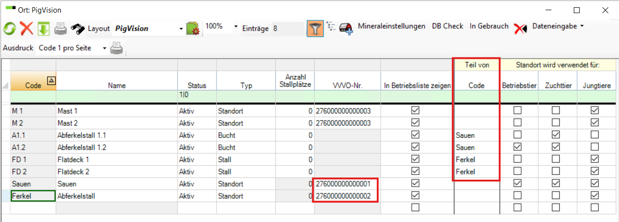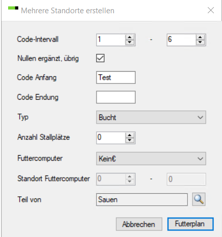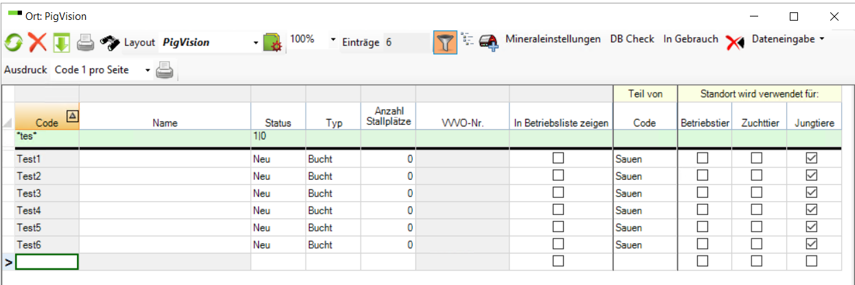 Im obigen Beispiel werden einige Buchten mit den Namen Test1 bis Test6 erstellt. Die Option "Code-Präfix" zeigt, wie Sie Ihren Buchten ein Buchstabenpräfix geben können. Um die Buchten einem übergeordneten Bereich & VVVO zuzuordnen müssen sie ein "Teil von" sein - hier sind sie ein Teil von Sauen.