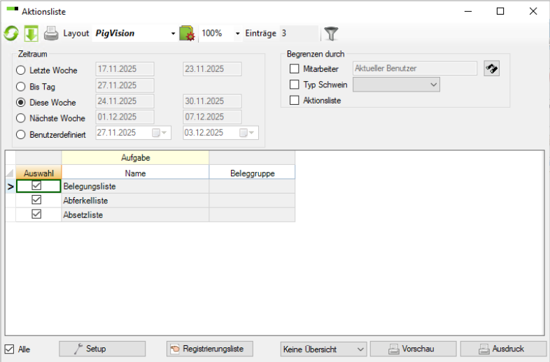 Wenn Sie eine Aktionsliste pro Belegungsgruppe erhalten möchten, müssen Sie die Aktionsliste öffnen und dann auf "Setup" klicken: