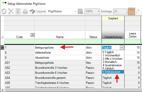 In der Spalte "Wiederholung" ist standardmäßig "Täglich" eingestellt, klicken Sie darauf und ein Dropdown-Menü erscheint. Hier wählen Sie "Belegungsgruppe" und es sieht wie folgt aus: