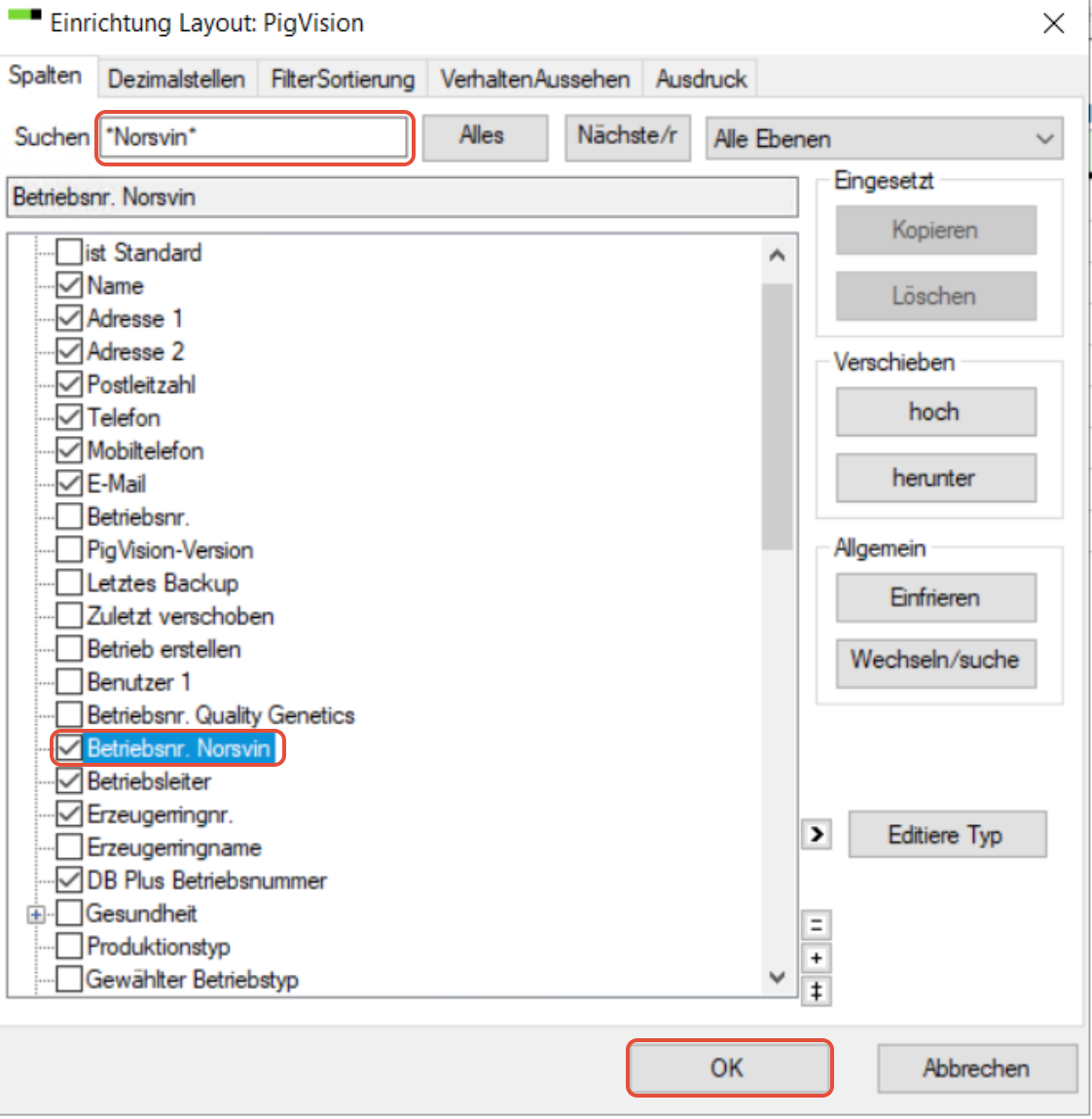 Ihre PigVision-Datenbank muss für Topigs Norsvin eingerichtet sein. Gehen Sie zu „Allgemein“ – „Betrieb auswählen“ und klicken Sie auf „Layout Setup“ und „Allgemeines“. Suchen Sie nach „Norsvin-Betriebsnummer“, setzen Sie ein Häkchen und klicken Sie auf „OK“.