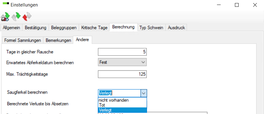 Gehen Sie zu „Allgemein“ – „Setup“ – „Berechnung“ – „Andere“. Klicken Sie neben „Saugferkel berechnen“ und wählen Sie: