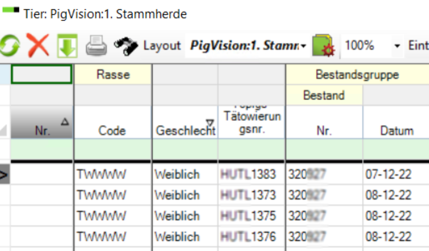 Im folgenden Beispiel wird ein benutzerdefiniertes Layout erstellt. Es enthält „Rasse”, „Topigs-Tätowierung” und „Bestandsgruppe” inkl. „Datum”, die über „Layout-Einrichtung” hinzugefügt wurden. Nun sind die Sauen im Datenaustausch mit Topigs Norsvin enthalten.
