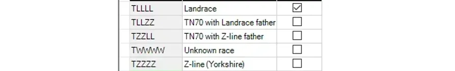 Topigs Norsvin haben 5 Buchstaben für die Rassecodes. Wie im dänischen Zuchtsystem steht immer die väterliche Rasse vorne. Siehe Beispiel unten: