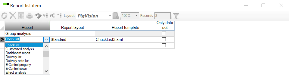 To select which reports and analyses the report list covers, double click on the report list in question. This will open the window shown below where you select report and a layout:
