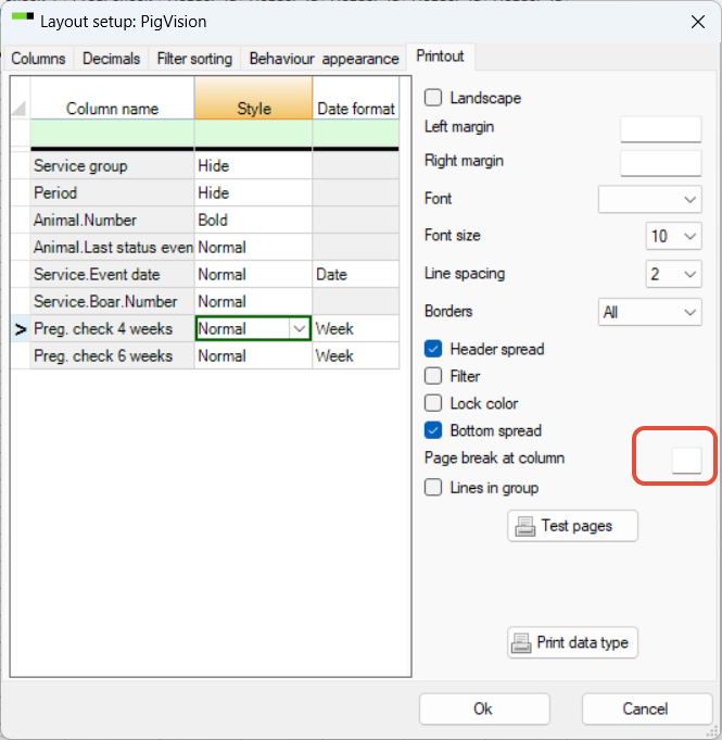 When printing a group card, you may see only few animals on one page. To change this, go to "Layout setup" - "Printout" tab. At "Page break at column no." check if it is a number there. This must be deleted, click OK to finish:
