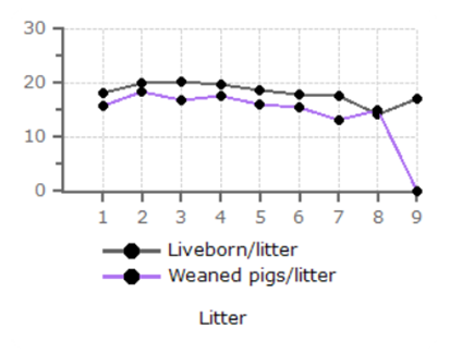 - Seleccione uno o dos indicadores clave para mostrar el gráfico. En el ejemplo siguiente, el gráfico muestra los indicadores clave «Cerdos nacidos vivos/camada» y «Cerdos destetados/camada».