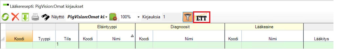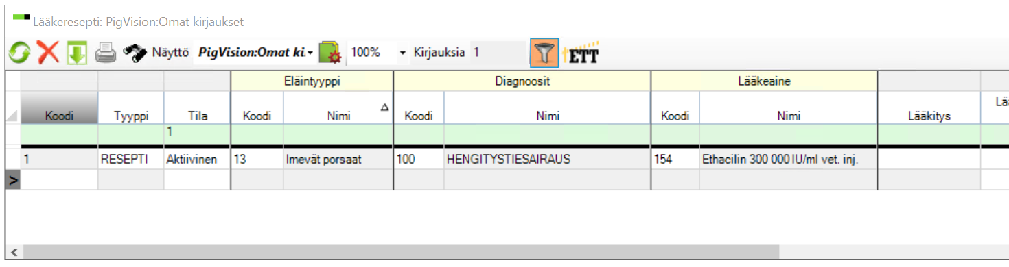 Ensimmäiselle tyhjälle riville syötät lääkereseptinkoodin. Esimerkissä 1.