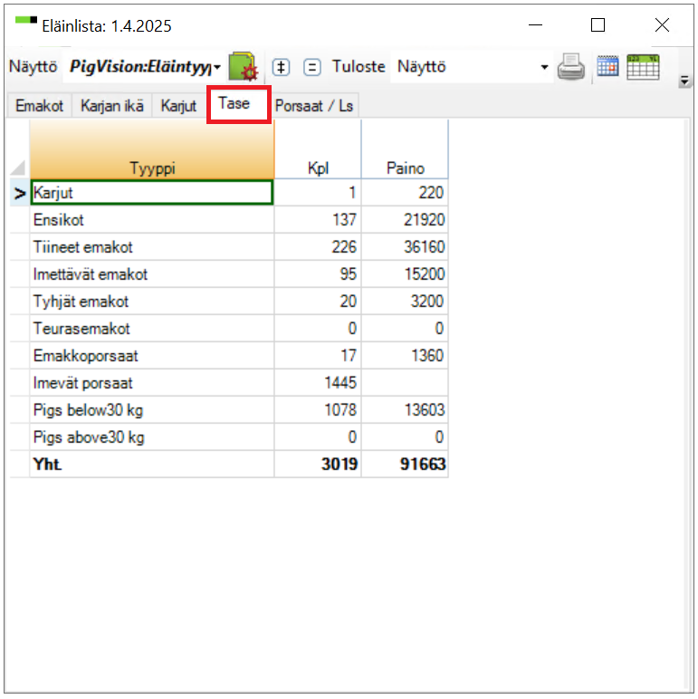 Valitse välilehti ”Tase” (punainen) ja syötä taseesi luvut oikealla päivämäärällä. (Tase löytyy täältä: ”Emakot/Karjut” – ”Eläintase”.)