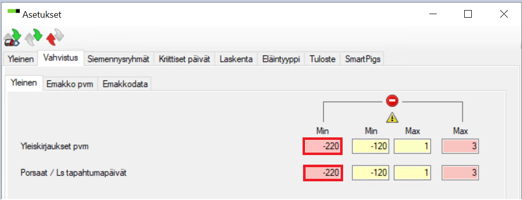 Jos aiot syöttää tietoja sekä emakoista että porsaista taaksepäin, molemmat ”Min.”-ruudut tulee korjata arvoon -9999.