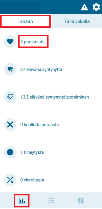 Kun olet tallentanut porsimisen, voit siirtyä sivun alareunassa olevaan kojelautaan ja valita ylhäältä tämän päivän saadaksesi yleiskatsauksen kaikista kyseisen päivän tallennetuista porsimisista, mukaan lukien alla olevien elävinä syntyneiden porsaiden lukumäärän.