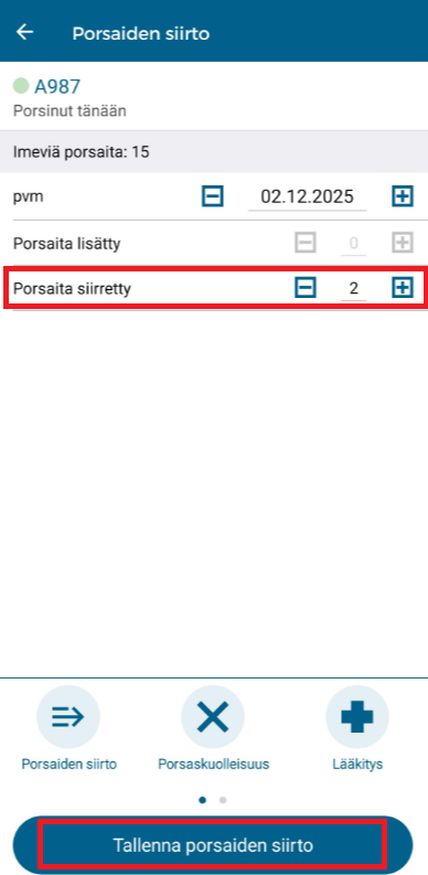 Tässä on poistettu 2 porsasta. Muista napsauttaa "Tallenna porsaiden siirto", kun olet valmis.
