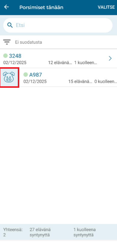 Kun napsautat "Porsimiset", saat yleiskatsauksen tänään porsineista emakoista. Kun näet emakon porsimisluettelossa ja haluat poistaa tai lisätä porsaita, napsauta kyseistä emakkoa listalla.
