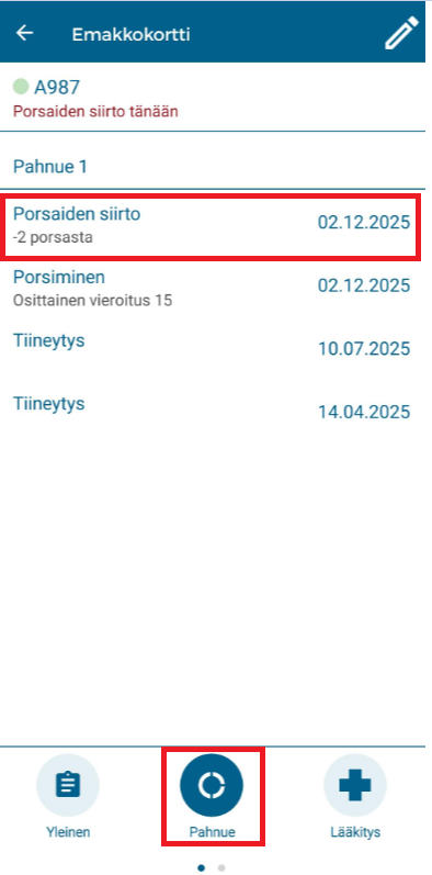 Voit myös saada yleiskatsauksen toimistasi emakkokortissa. Palaa takaisin tänään porsivien emakoiden listaan ja pyyhkäise oikealle saman emakon kohdalla. Napsauta sika -kuvaketta.