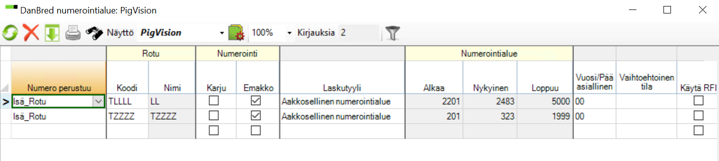 Kun olet tallentanut karjanumerosi, voit määrittää porsaille numerointialueita.