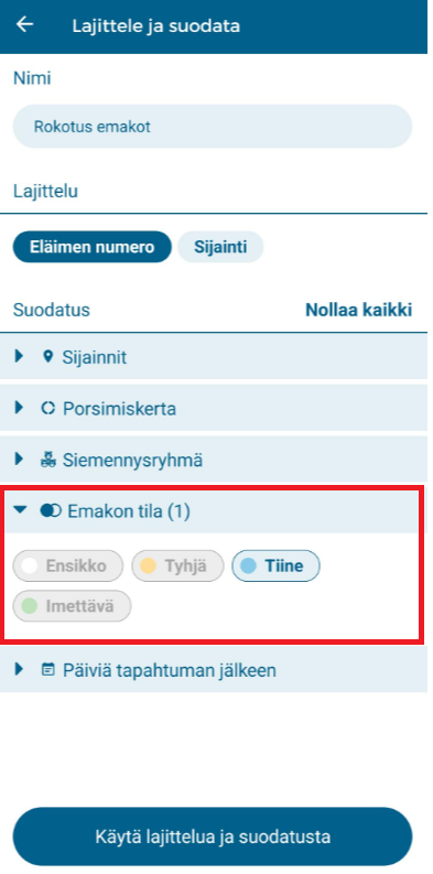 Aseta suodatin, joka vastaa rokotettavien emakoiden tilaa. Alla olevassa esimerkissä "Emakon tila" -suodattimeksi on asetettu "Tiine":