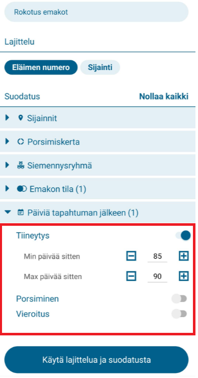 Myös "Päiviä tapahtuman jälkeen" -suodattimeksi on asetettu "Tiineytys" ja tiineytyksen jälkeisten päivien vähimmäis- ja enimmäismääräksi on asetettu 85–90. Kun olet valmis, napsauta "Käytä lajittelua ja suodatusta".