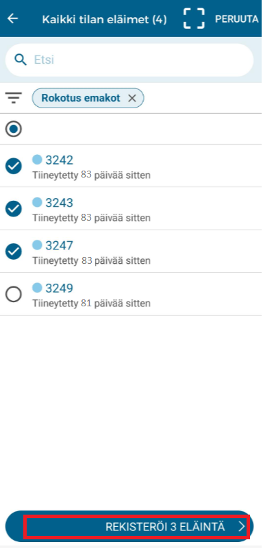 Napsauta "Valitse" valitaksesi rokotettavat emakot. Kun olet valinnut emakot, joille haluat kirjata rokotukset, napsauta alla olevaa "Rekisteröi X eläintä".