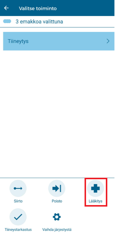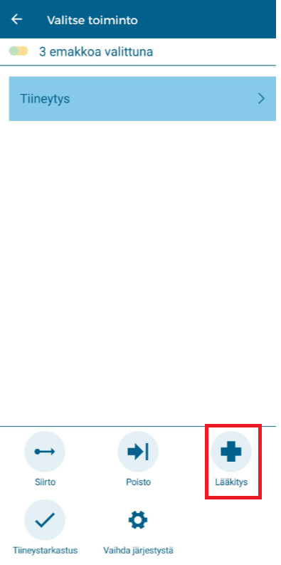 Napsauta kohdassa "Valitse toiminto" kohtaa "Lääkitys" kirjataksesi rokotukset valituille emakoille.