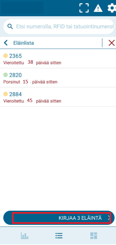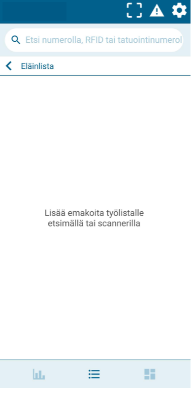 "Työlistani" -kohdassa voit lisätä eläimiä listaan kirjoittamalla emakon numeron, skannaamalla QR-koodin tai käyttämällä elektronisten korvamerkkien lukijaa.