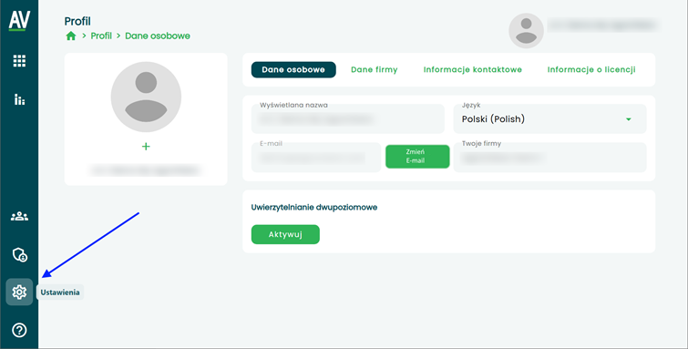 1. Klikamy przycisk menu Ustawienia w lewym dolnym rogu.