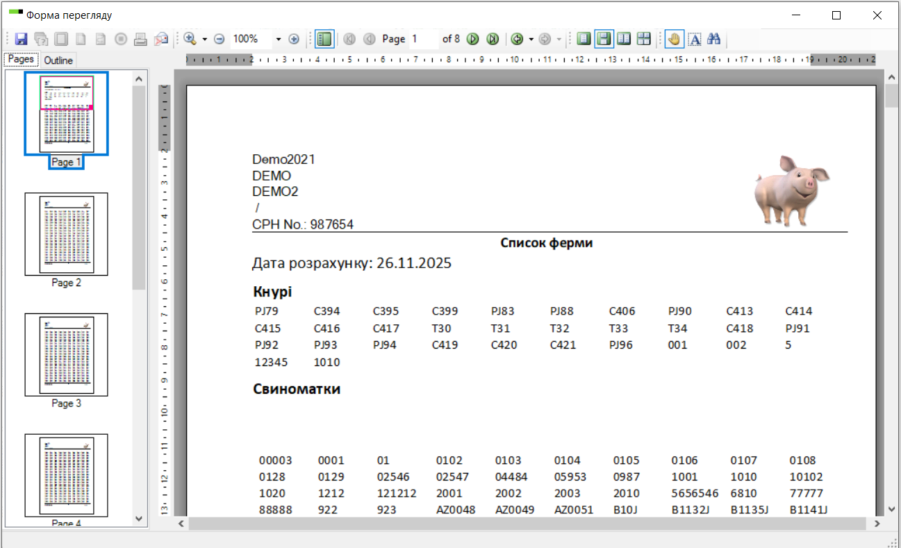 Натисніть на друк «Список ферм», і ви отримаєте список ферми із вашими тваринами.