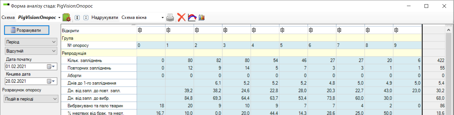 Наприклад, аналіз стада по опоросам за замовчуванням відображається так: