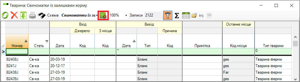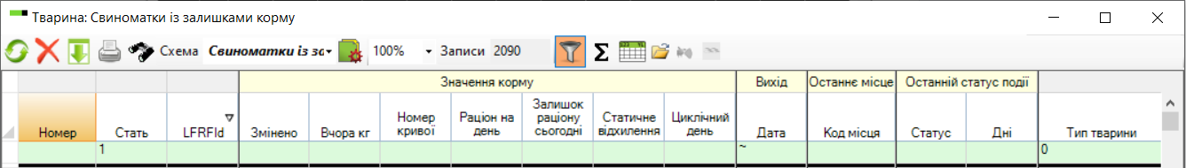 Список «Свиноматки із залишками корму» можна використовувати для створення огляду кількості з'їденого корму та позиції тварин у системі транспондерів.