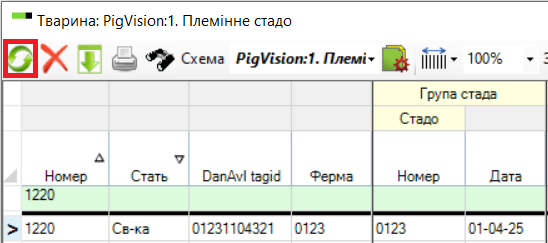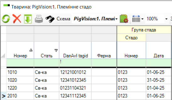Натисніть на значок "Налаштування схеми" та додайте стовпці: "DanAvl tagid ", "Ферма" та "Група стада" - "Стадо" - "Номер" та "Дата"