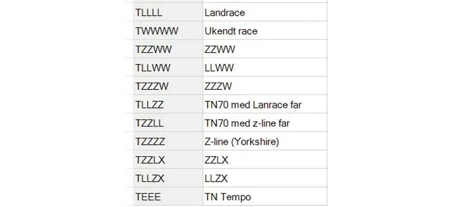 Topigs Norsvin мають 5-літерні коди породи. Як і в данській системі розведення, попереду завжди йде порода батька. Дивіться приклад нижче:
