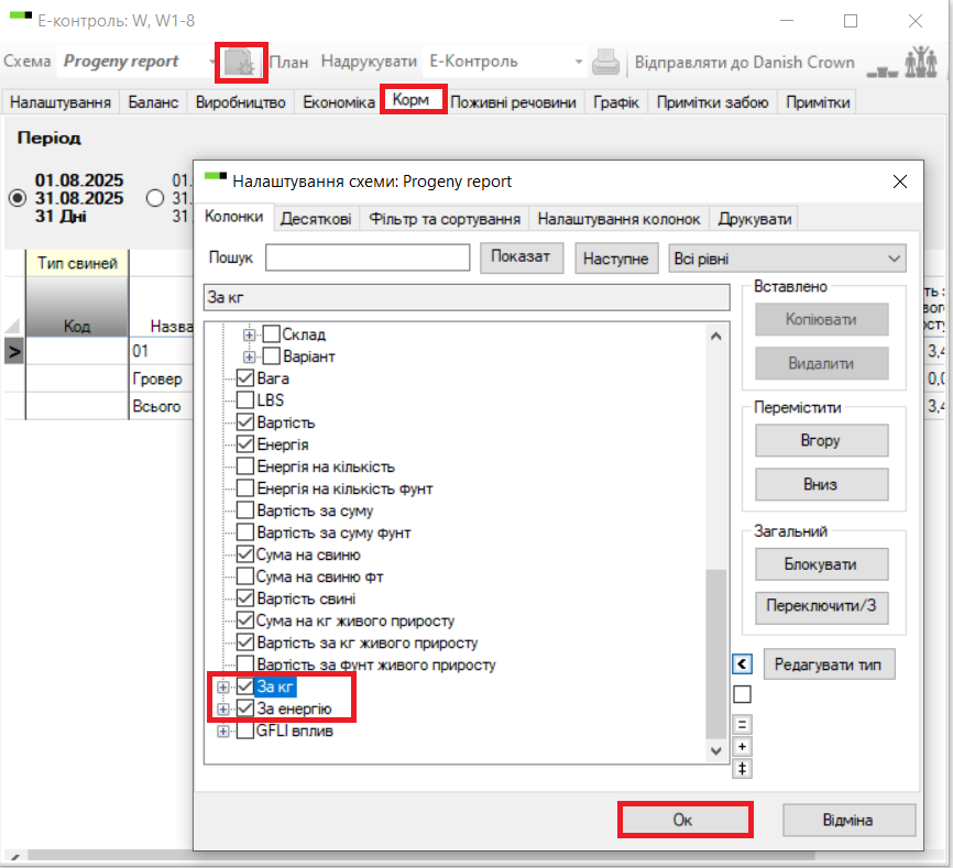 Перейдіть до вкладки «Корм» та натисніть на значок «Налаштування схеми». Тут ви можете знайти та встановити позначки «За кг» та «За енергію». Після встановлення позначок виберіть, які поживні речовини ви хочете бачити.