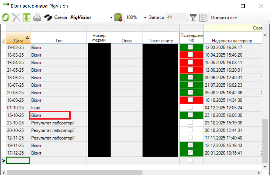 Відкрийте PigVision та перейдіть до розділу «Загальні реєстрації» – «Візит ветлікаря». Двічі клацніть на візиті, документи якого ви хочете зберегти.