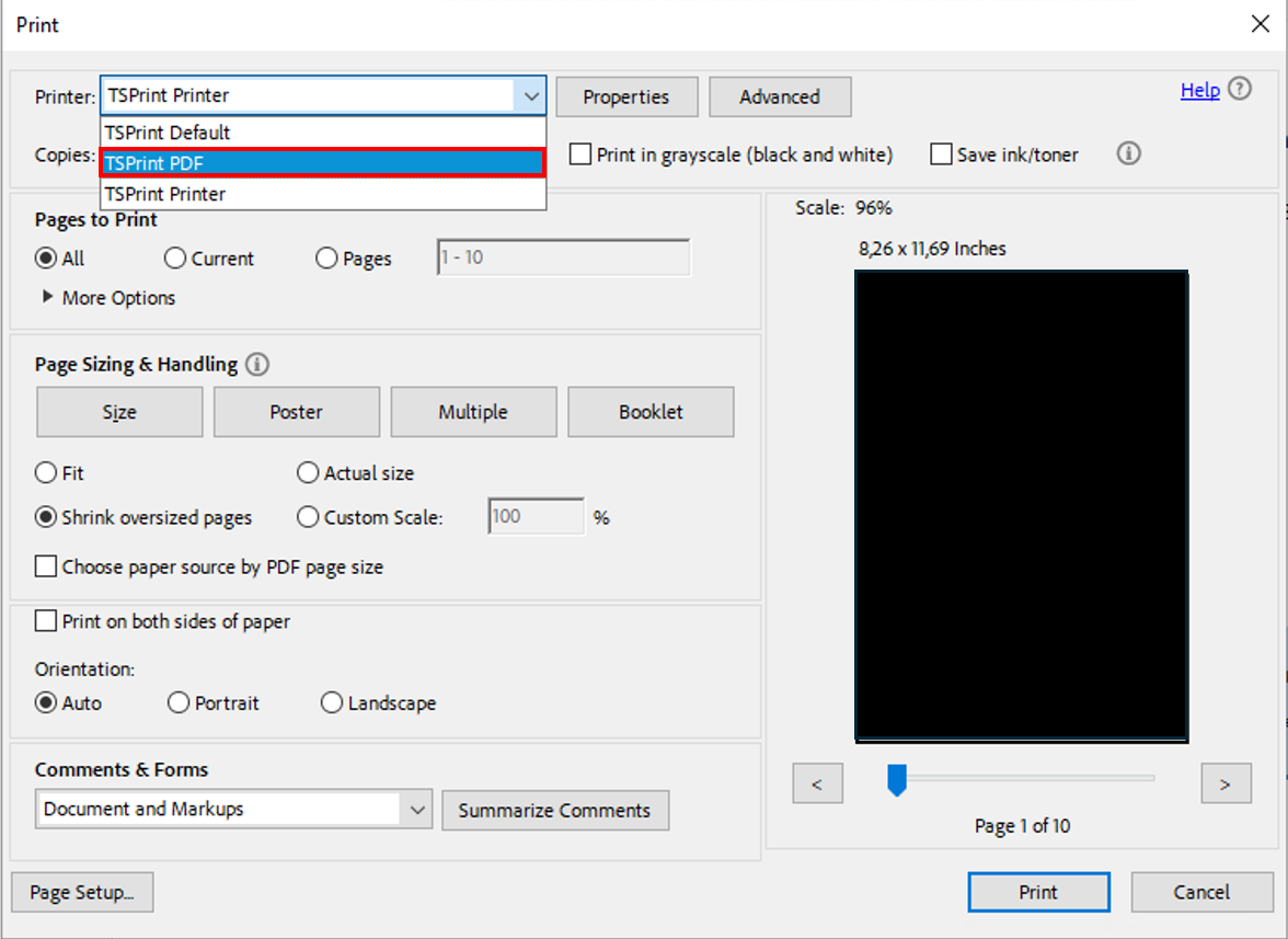 Щоб зберегти документ на ПК, виберіть «TSPrint PDF» у розділі «Printer:». Натисніть «Print» праворуч нижче.