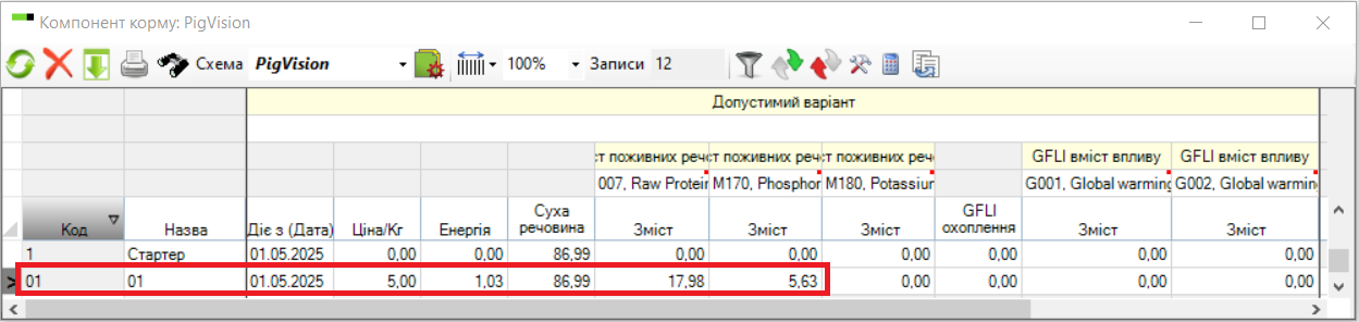 Знайдіть потрібний корм та введіть значення різних поживних речовин.