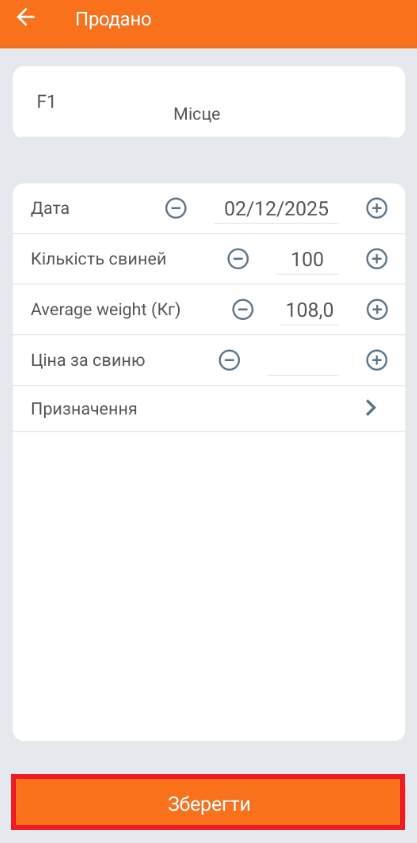 Виберіть місце, зареєструйте дату, кількість тварин та вагу. Ви також можете вказати ціну за свиню та призначення, якщо потрібно.