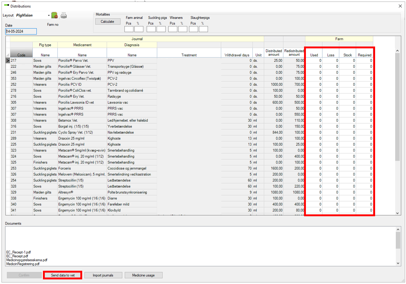 Після імпорту медичних записів стовпці стануть білими, і можна буде зареєструвати, скільки ліків було використано, втрачено, є в наявності та скільки потрібно для наступного замовлення. Особливо зручна опція «Бажана кількість», оскільки ви можете натиснути «Надіслати дані ветеринару», і ветеринар отримає наступне замовлення на ліки.
