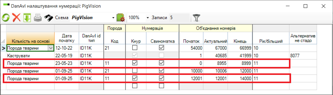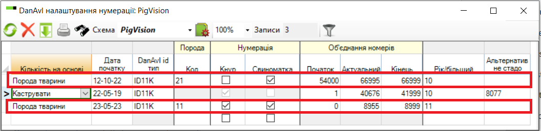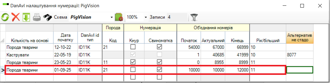 Під час нумерації племінних поросят, де для параметра «Стиль підрахунку» встановлено значення «Нумерація», може статися так, що під час нумерації поросят не всі поросята будуть позначені. Це означає, що поточна серія номерів (нумерації) вичерпана, а наступна серія номерів ще недоступна.