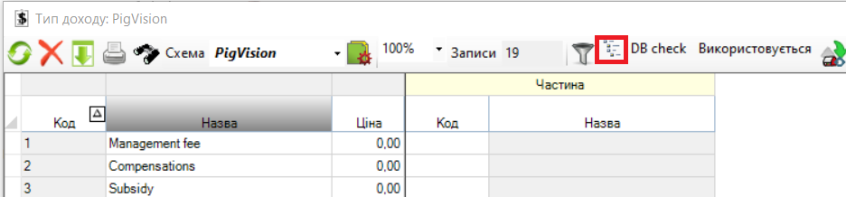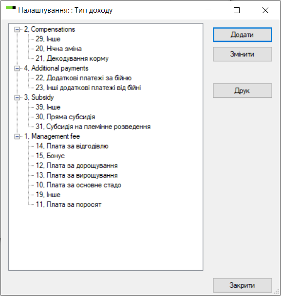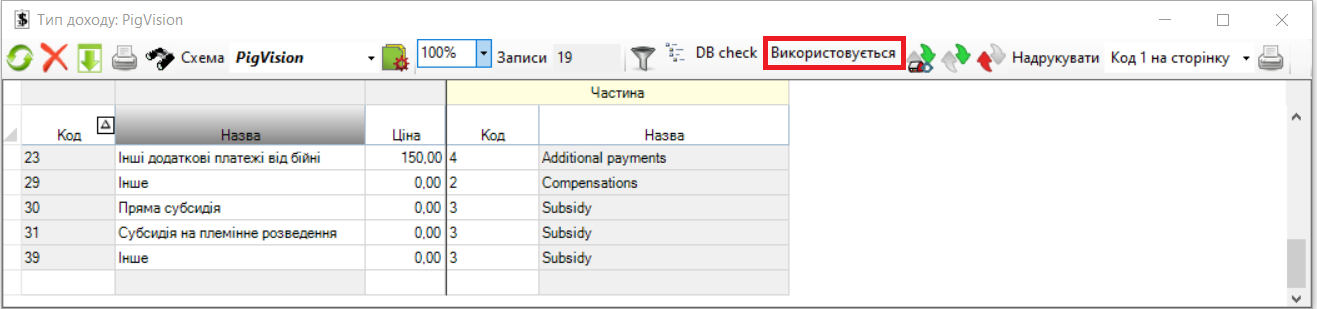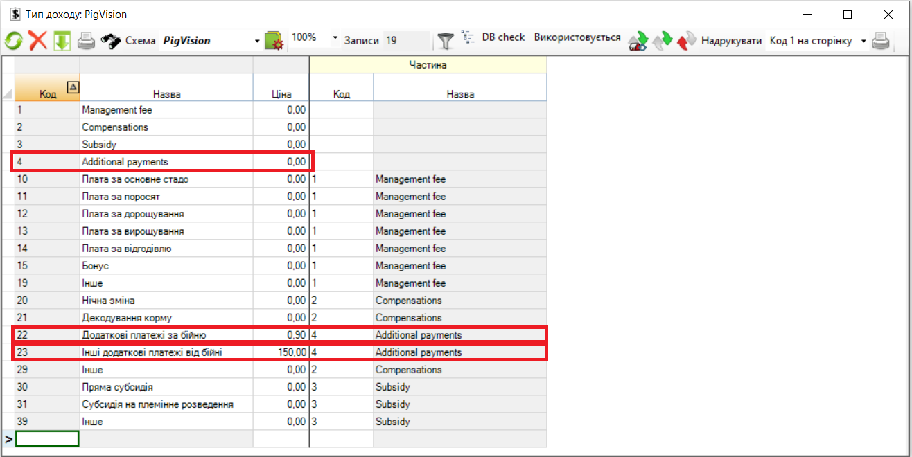 Колонка «Частина» використовується для позначення того, чи є тип доходу частиною загального типу доходу. Якщо це так, ви повинні пам’ятати, що спочатку потрібно створити загальний тип доходу з кодом та назвою. Як приклад, приведено загальний тип доходу «Доплата», частиною якого є типи доходу «Додаткові платежі за бійню» та «Інші додаткові платежі від бійні». Тому ці два типи доходу повинні бути пов’язані з кодом 4.